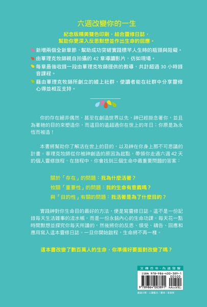 紀念版精美雙色印刷,結合靈修日誌,幫助你更深入反思默想並作出生命的回應。新增兩個全新章節,幫助成功突破實踐標竿人生時的瓶頸與阻礙。